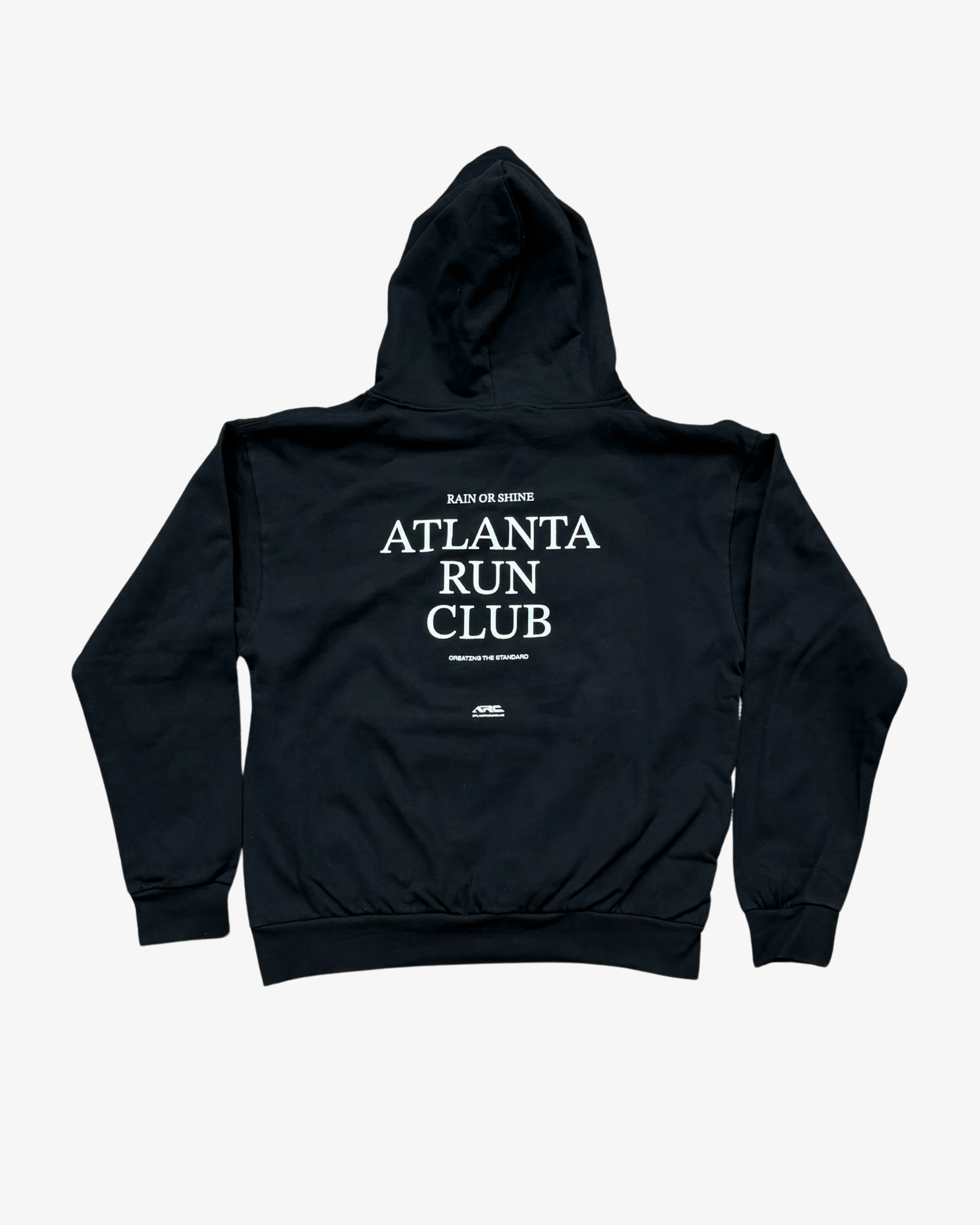 The original "Rain or Shine" hoodie of Atlanta Run Club. The phrase on this piece captures the energy and attitude of our club. No matter what the conditions are, we show up and get our miles in. Running is hard - but continuing to show up for yourself will make you stronger.